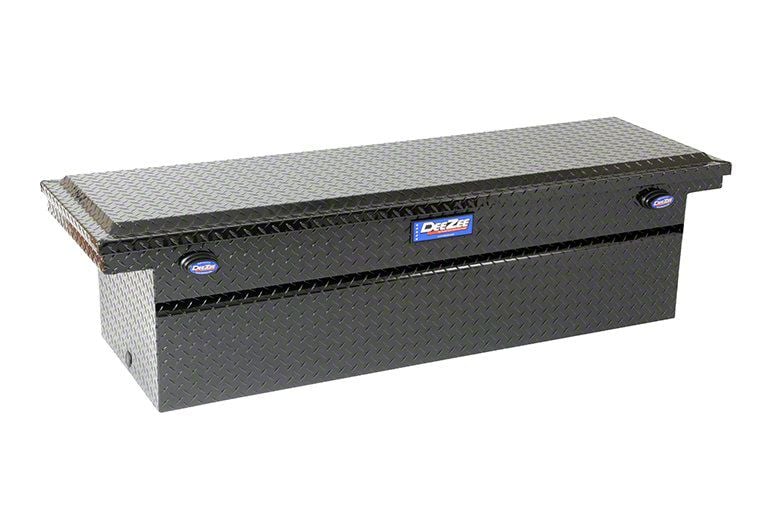 Dee Zee Tool Box - Blue Label (Contractor Grade) Single Lid Crossover. Constructed of heavy gauge Brite-Tread aluminum. Large push button with self-adjusting latches. Hidden hinge, gas shocks, Alumaguard strengthening channel, and adjustable strikers on a hat style lid. Removable plastic tool tray to help keep small items organized.