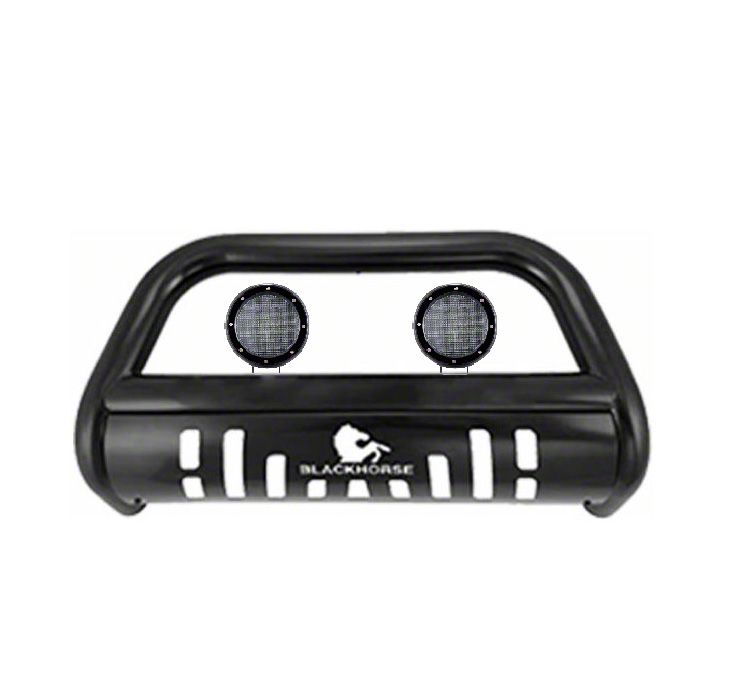 Protection and Illumination. The Bull Bar with Black Skid Plate and 5.30-Inch Black Round Flood LED Lights in Black is a durable and stylish addition to enhance your vehicle's front-end protection and lighting capabilities. Equipped with two 5.30-inch round LED lights, this bull bar enhances visibility on the road with its flood beam pattern. The black housing complements the overall design, adding a touch of sophistication to your vehicle's exterior.
