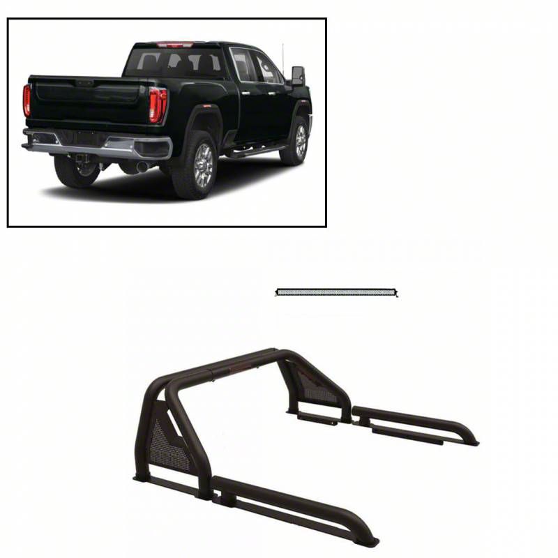 Feature-Loaded Roll Bar Kit. Roll Bars add more muscular appeal to your truck and the Gladiator Roll Bar with 40-Inch LED Light Bar in Black offers that and more. This roll bar kit includes a 40-inch LED light bar and has been built with third brake light. It has a mandrel-bent tube that shows off smooth OEM-style bends and features heavy-duty bed rails that run along the length of the cab for added design.