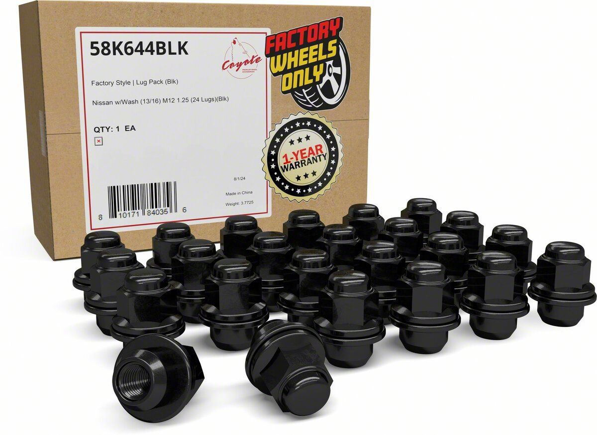 Durable OEM-Style Wheel Hardware. The OEM Factory Style Black Lug Nut Kit provides a reliable and stylish upgrade for 2004-2024 Nissan Titan trucks. Designed as a solid one-piece construction, these lug nuts replace the factory two-piece design to eliminate issues with swelling or delamination caused by moisture. With their sleek black finish, they add both durability and a modern appearance to your wheels.