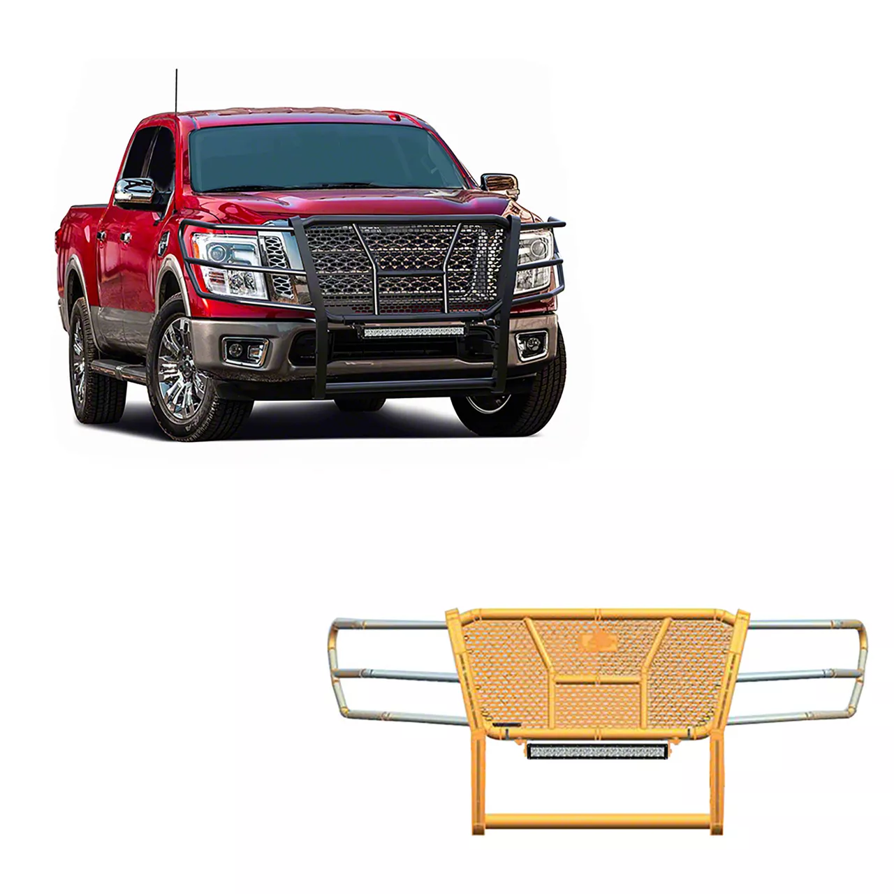 Heavy Duty. Made for the Nissan Titan, this Grille Guard has a heavy-duty and protective design. Meant to protect the front of your ride from bumps and hits, this grille guard has a protective modular design with a hexagonal design mesh to allow proper air intake into your engine bay. Due to its full-width design, this grille guard may interfere with emergency braking systems, adaptive cruise control, and parking sensors.