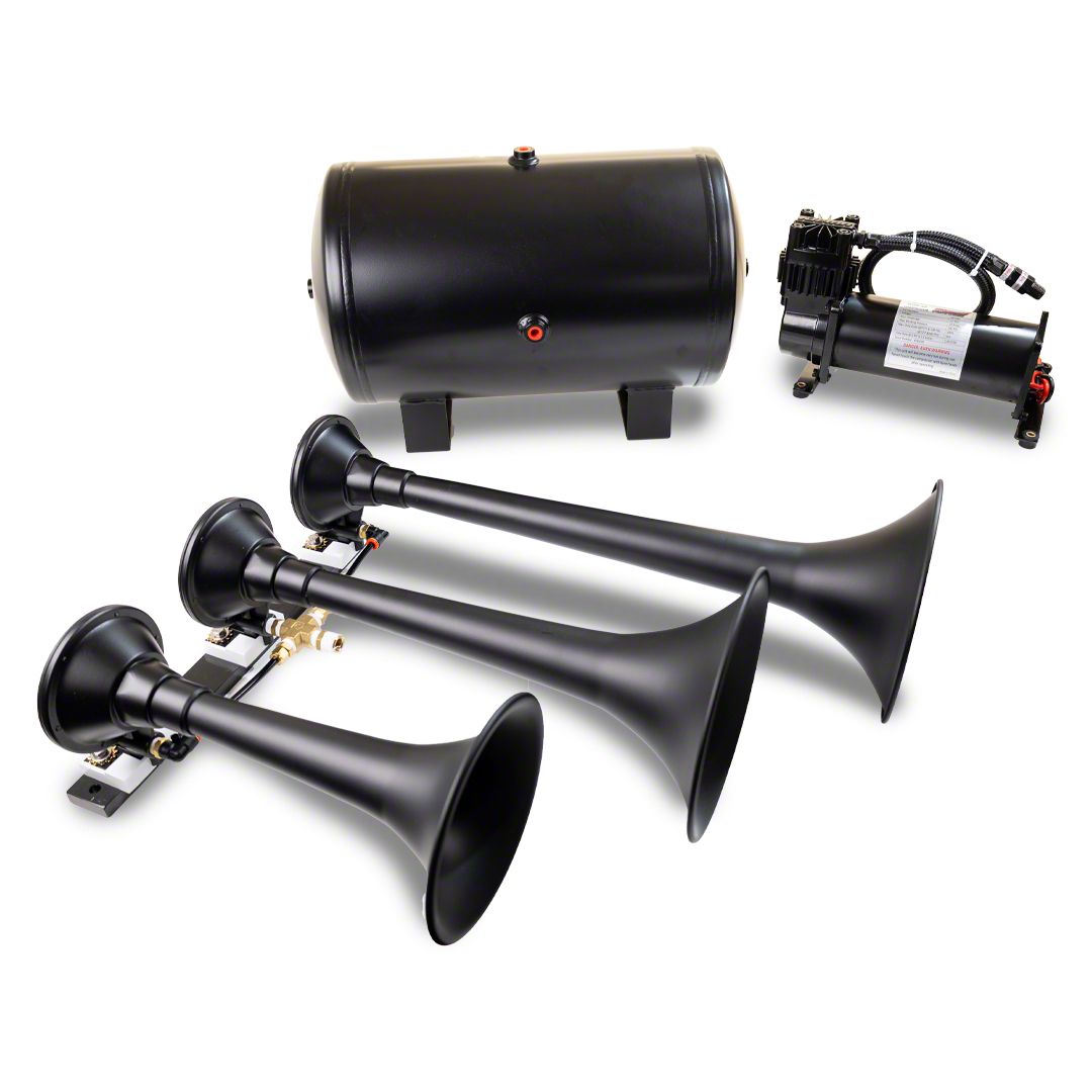 Unmatched Performance. The horns themselves come in your choice of steel or ABS plastic, giving you options for your preferred material. The massive and detachable XCR 2.0™ spun steel trumpets (measuring 18.25", 14.75", and 10.5") ensure the sound reaches far and wide. With a high-output 150 Psi, 100% duty compressor, and a substantial 5-gallon tank, this kit delivers unmatched performance. Plus, it includes a tire inflation kit with a convenient storage bag. If you're looking to take it to the next level, you can upgrade it with the Ultra Blast Master; valve for an even more impressive auditory experience. Unleash the power of sound with the ProBlaster Triple Train Horn System, the ultimate automotive accessory.Installation. The installation of the ProBlaster Triple Train Horn System; Black typically involves bolting for secure mounting and no drilling.