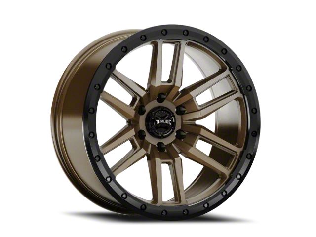 The 20x9 Torque Wheels TW411C Pritchett Bronze with Black Lip 6-Lug Wheel; 20x9; -12mm Offset is completed in a high-quality bronze finish with a black lip, which is sure to turn heads. There is a durable clear coat for extra protection and enhanced appearance that can withstand the rigors of the road.