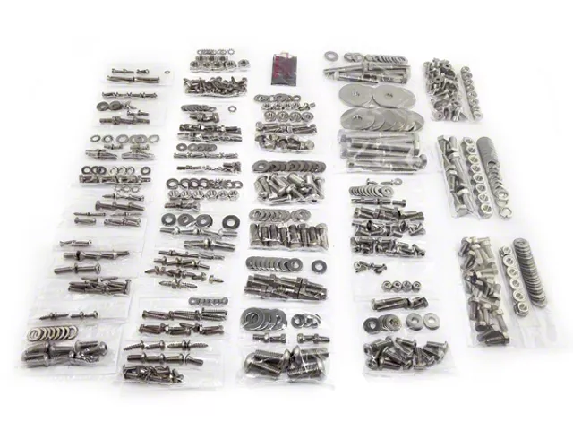 Construction. The Stainless Steel Fastener Kit is one of Totally Stainless' comprehensive fastener kits. It includes 703 pieces, which incorporate fender mounting bolts, steering column mounting bolts for the firewall, seat mounting bolts, body mounting bolts, nuts, screws, washers, and numerous other parts. 2 large body washers are not included. For use with soft top Jeeps only.