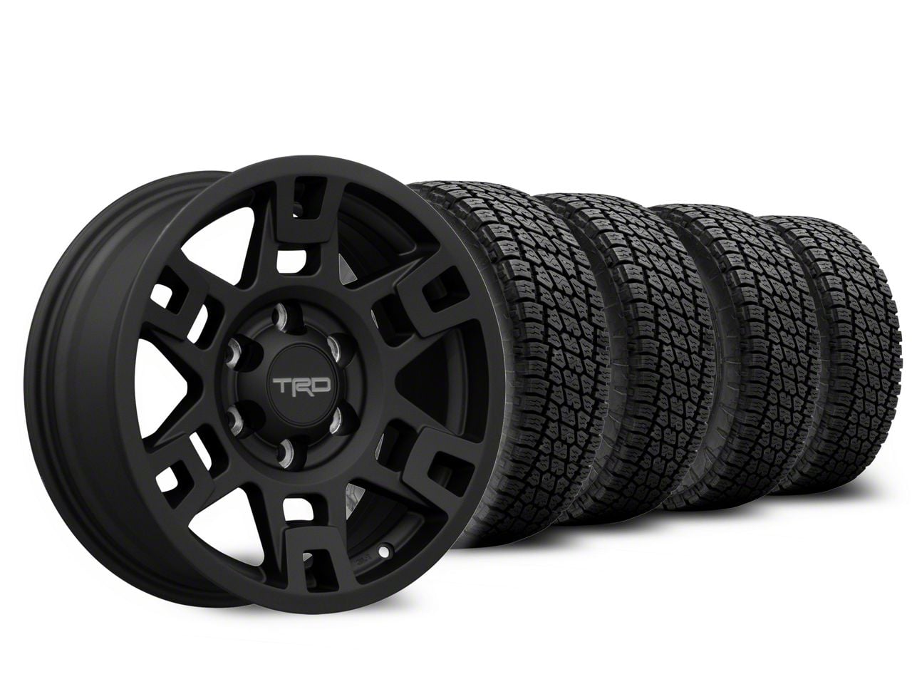 Mounted and Balanced Wheel and Tire Kit. This wheel and tire combo kit features (4) 17x7 Toyota TRD 4Runner Matte Black 6-Lug Wheels and (4) NITTO Terra Grappler G2 All-Terrain 265/70R17 tires that have been put together into an easy to buy kit that arrives to your door already mounted and balanced ready to be installed on your vehicle.