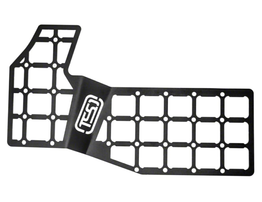 Organizing and Accessibility. Have all your tools ready when you need them with this Trail Standard Offroad MMS Center Console Molle Panel System; Driver Side. Precision machined to match the mounting specifications of MOLLE type brackets and backplates, this assembly features a strong structure that is thin and compact to fit right beside you on the center console.