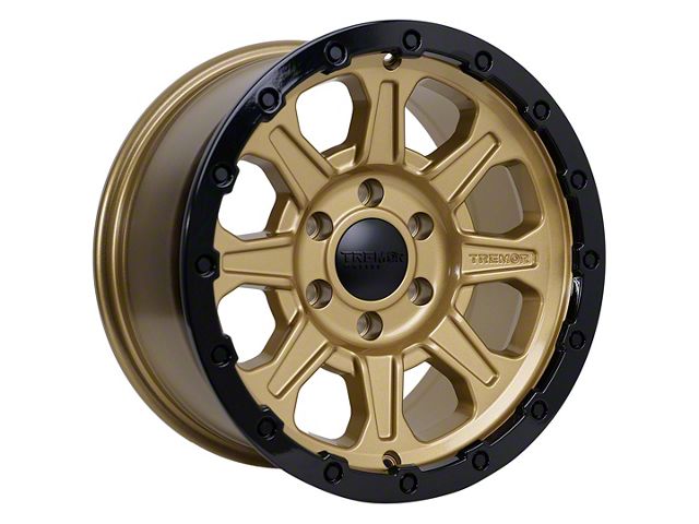Tremor Wheels 103 Impact Gloss Gold with Gloss Black Lip 6-Lug Wheel; 17x8.5; 0mm Offset offers a striking balance between style and durability. The design speaks to the brand's commitment to quality, enhancing the vehicle's appearance with its distinct look. This wheel, with its unique aesthetics, is ideal for drivers who appreciate a blend of modern design and robust functionality.