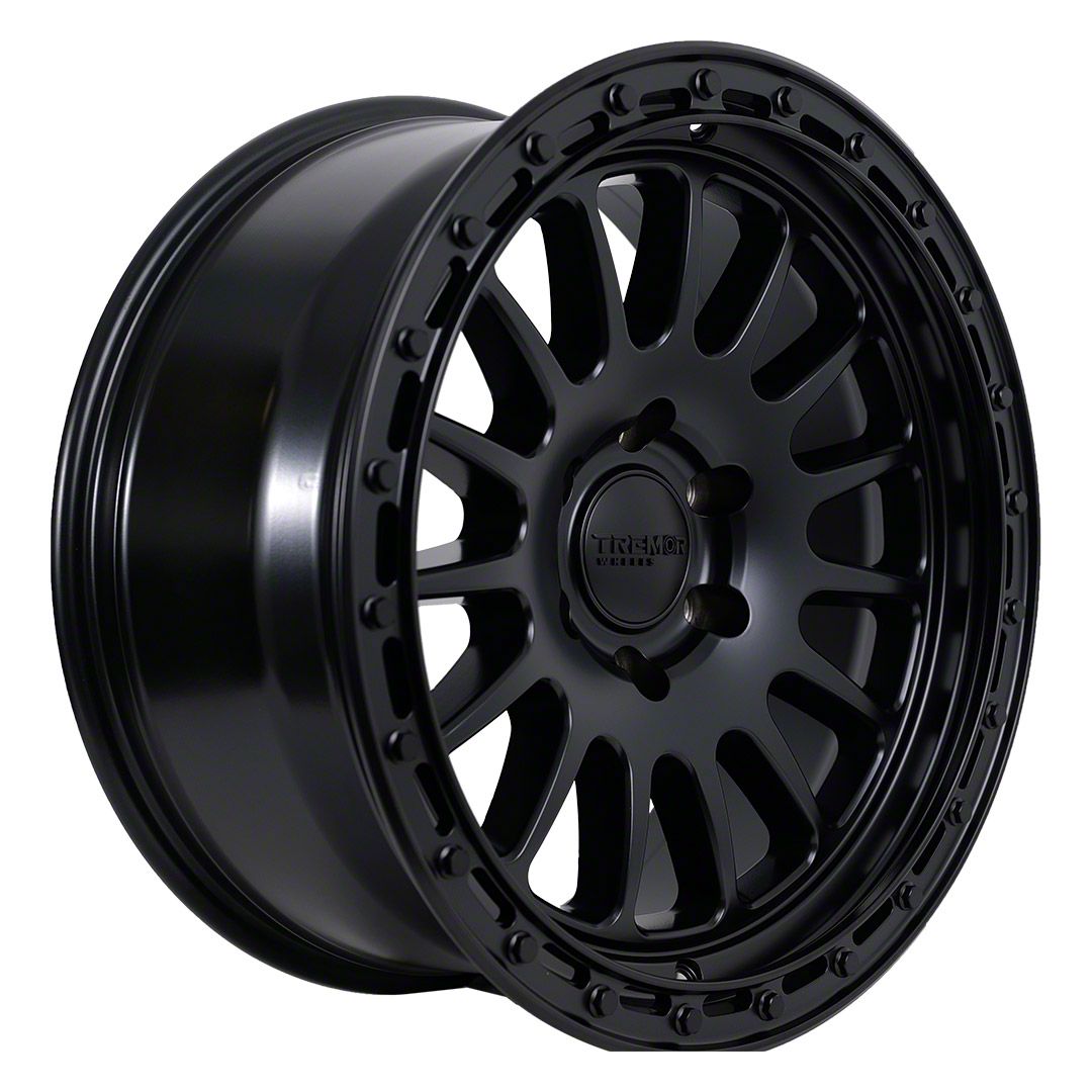 The 20x9 Tremor Wheels 104 Aftershock Satin Black 6-Lug Wheel is completed in a high-quality satin black finish, which looks great. Thanks to a durable clear coat, the finish also protects against the rigors of driving.