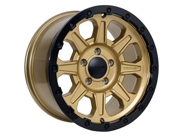 Tremor Wheels 103 Impact Gloss Gold with Gloss Black Lip Wheel; 17x8.5 presents a striking balance of style and sophistication. The design of this wheel accentuates the vehicle's appearance, complementing its distinctive character. Its construction reflects the premium quality expected from Tremor Wheels.