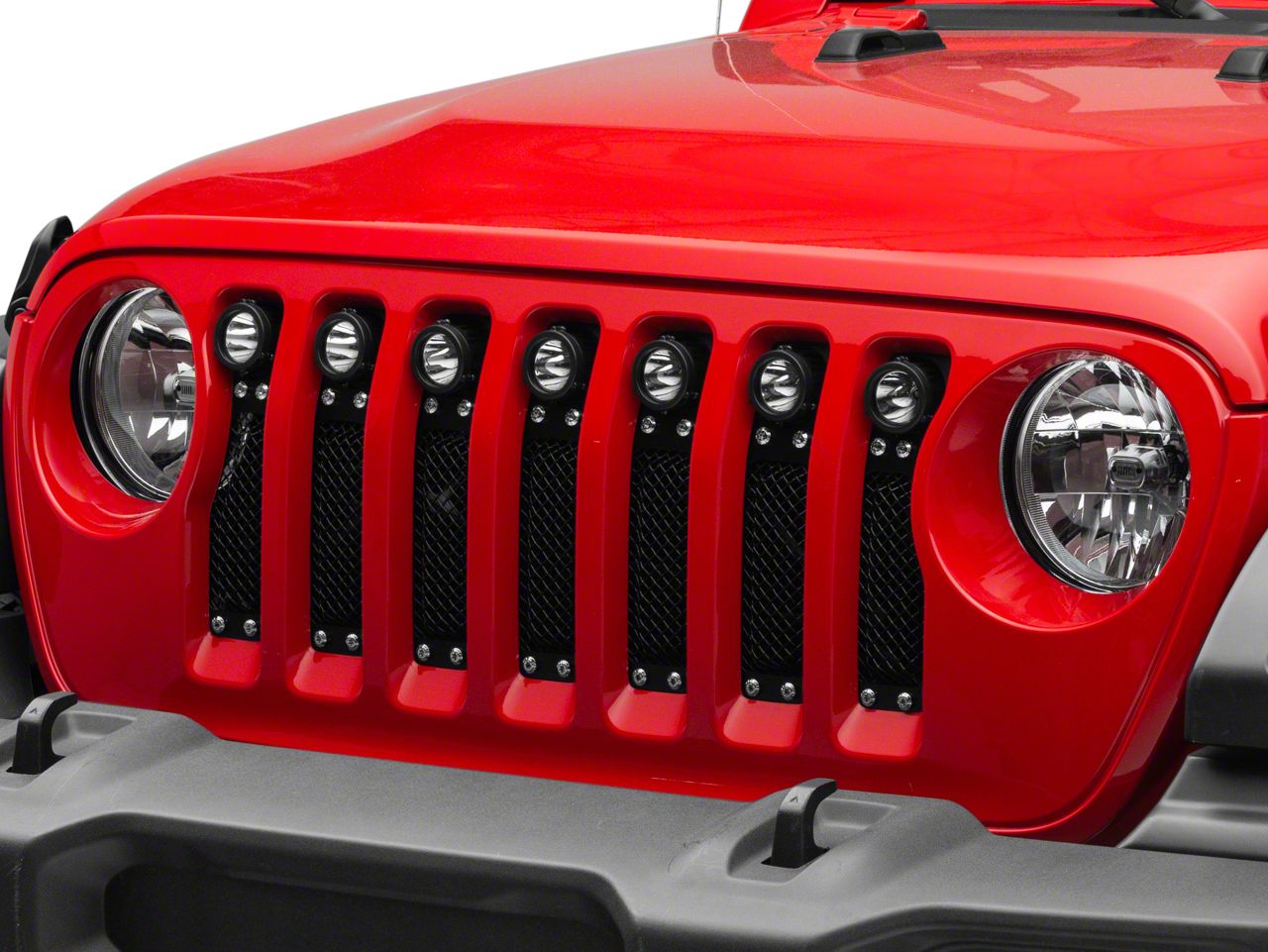 Aggressive Grille Style Perfect for Off-Roading. The T-REX Torch Series Grille Insert with Chrome Studs and LED Lights upgrades the style of your Jeep by making the front end stand out more. The bumper gets an understated black mesh with chrome studs, a design that’s sure to attract everyone’s attention. Aside from the impressive looks, this grille insert is also very functional with 7 2-inch LED lights integrated for additional lighting.