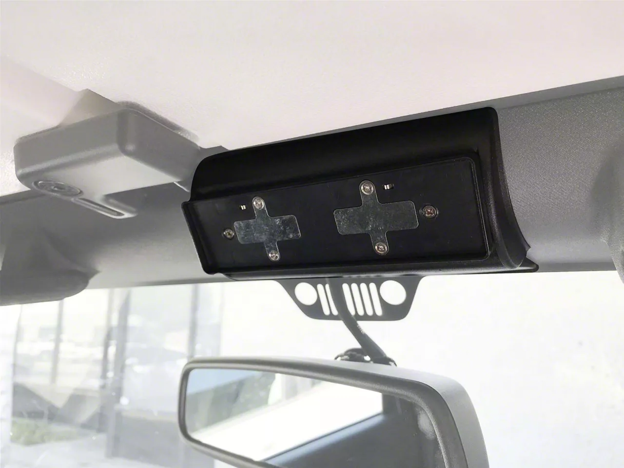 Easy to Install, Easy to Remove. If you're looking for an easy-to-install, OEM-looking remote mount system for your Wrangler, the Trigger Wireless Control System 6 Shooter Overhead Remote Mount is the perfect solution. This tough and durable system mounts to your windshield frame with no drilling required, which can also be removed just as easily if you ever want to take it off.
