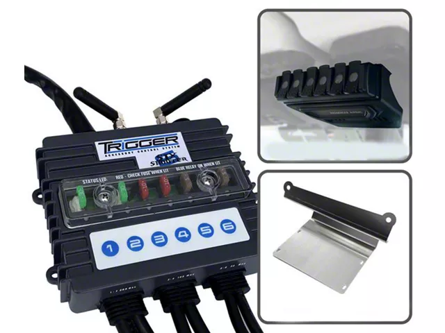 Greater Convenience. Manage all 6 of your accessories, devices, and tools In one place with this Trigger Wireless Control System 6 Shooter Wireless Accessory Controller Kit on your Jeep Wrangler. Sporting a compact design, it offers plug-in connectors of varying amperes so you can hook up your tools and use them with ease.