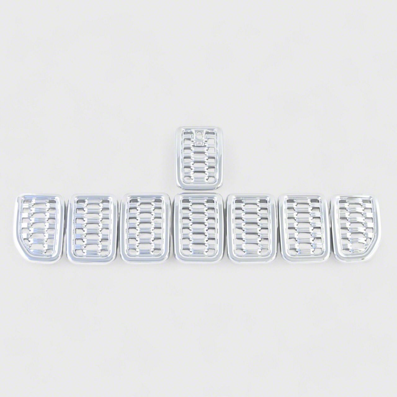 Elevate the front end of your Jeep Grand Cherokee with our 8 PCS Chrome Snap-on W/Tape Patented Grille Overlay. Crafted with precision and style, this overlay is designed to fit grilles with or without a camera, ensuring a seamless enhancement for your vehicle. Its user-friendly installation process and durable construction make it the ideal choice for upgrading your vehicle's aesthetics.