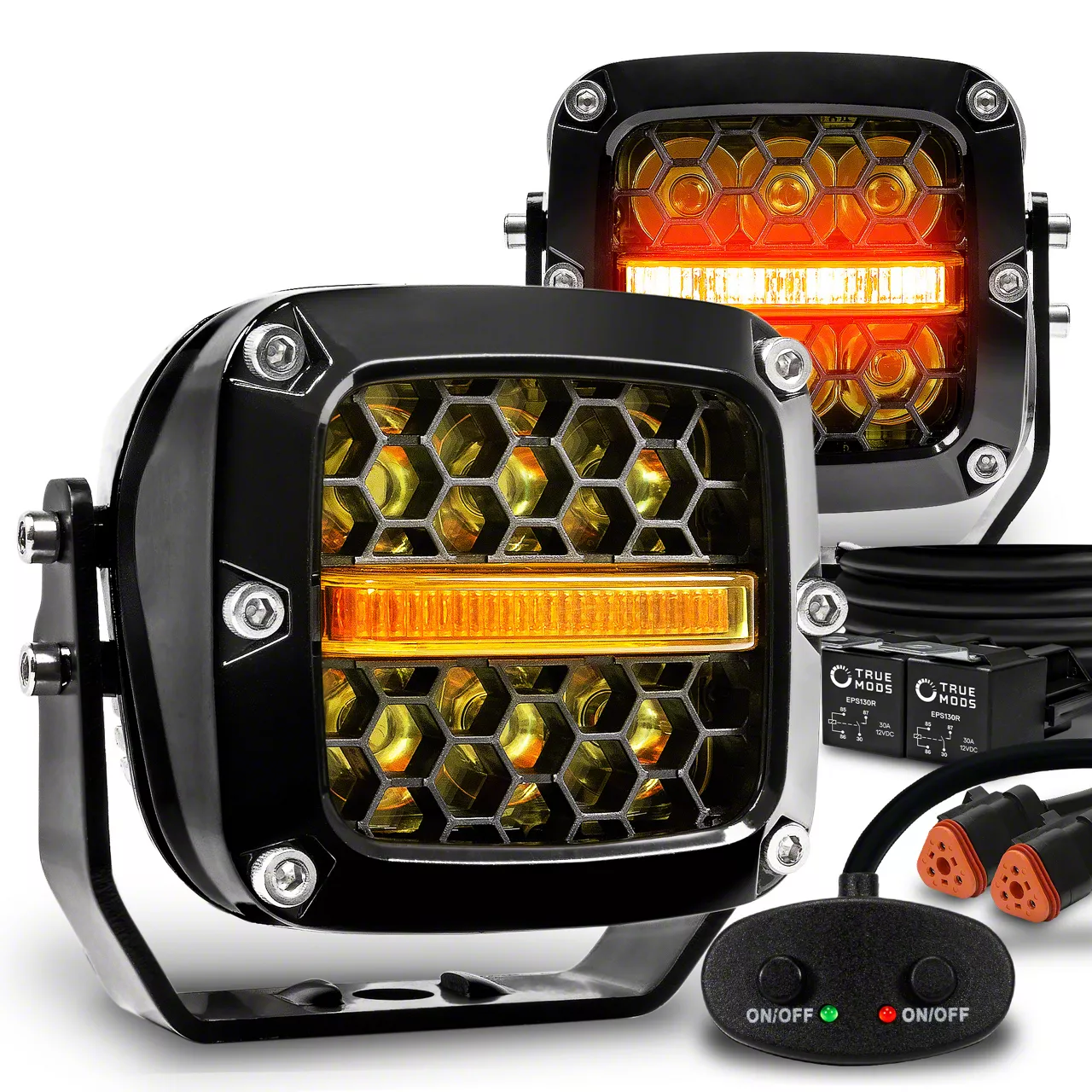 Construction and Appearance. Housed in a rugged, rigid aluminum body, these pod lights are built to endure tough environments while maintaining a clean, aggressive appearance. With an IP67 waterproof rating and high-efficiency amber LEDs, they offer reliable performance in rain, dust, and mud. The integrated plug-n-play design ensures fast connectivity without custom wiring.