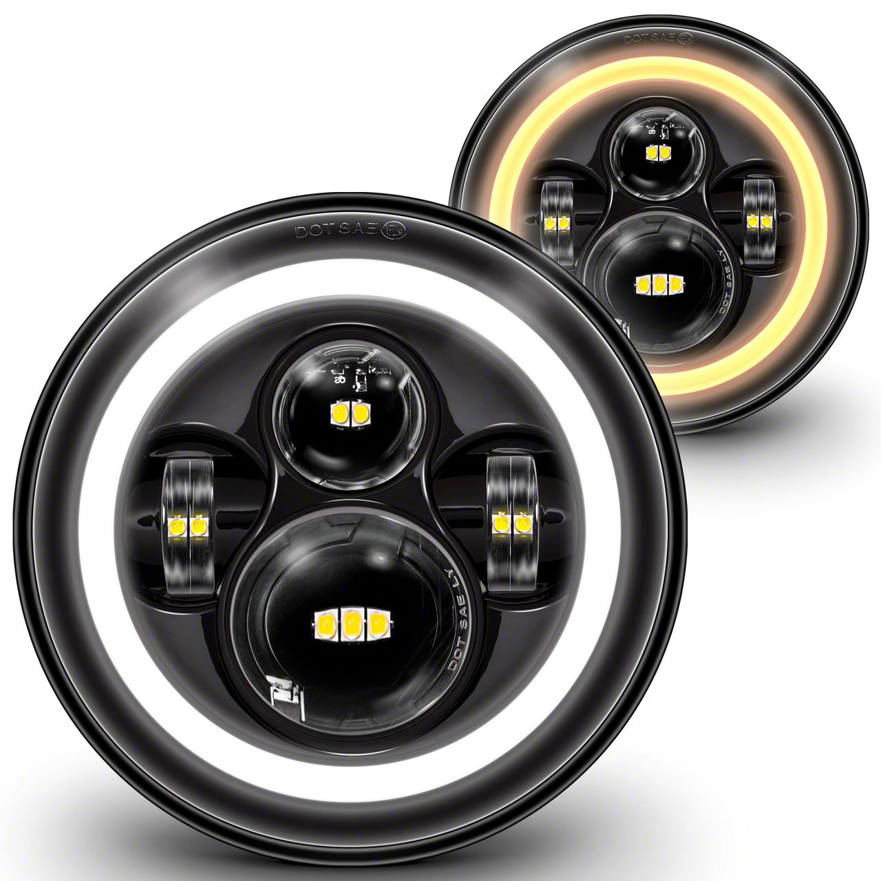 Modern LED Halo Design. The True Mods 7-Inch LED Halo Headlights; Black Housing; Clear Lens upgrade your 2007–2018 Jeep Wrangler JK with a bold, modern look. Featuring integrated halo rings that function as running lights and amber turn signals, these headlights combine style and utility for a striking front-end appearance.
