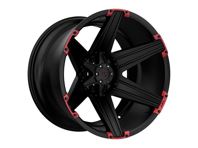 Tuff A.T. T12 Satin Black with Red Inserts 6-Lug Wheel; 24x11; -25mm Offset exudes sophistication with its finish, offering a sleek and modern appeal to any vehicle it adorns. The design is meticulously crafted to enhance the aesthetic of your vehicle, giving it a distinctive and upscale look. Perfect for those seeking to elevate their vehicle's style, this wheel blends seamlessly with both contemporary and classic vehicle designs, making it a versatile choice for a wide range of vehicles. Its robust construction ensures durability, making it a reliable choice for drivers who value both style and quality.