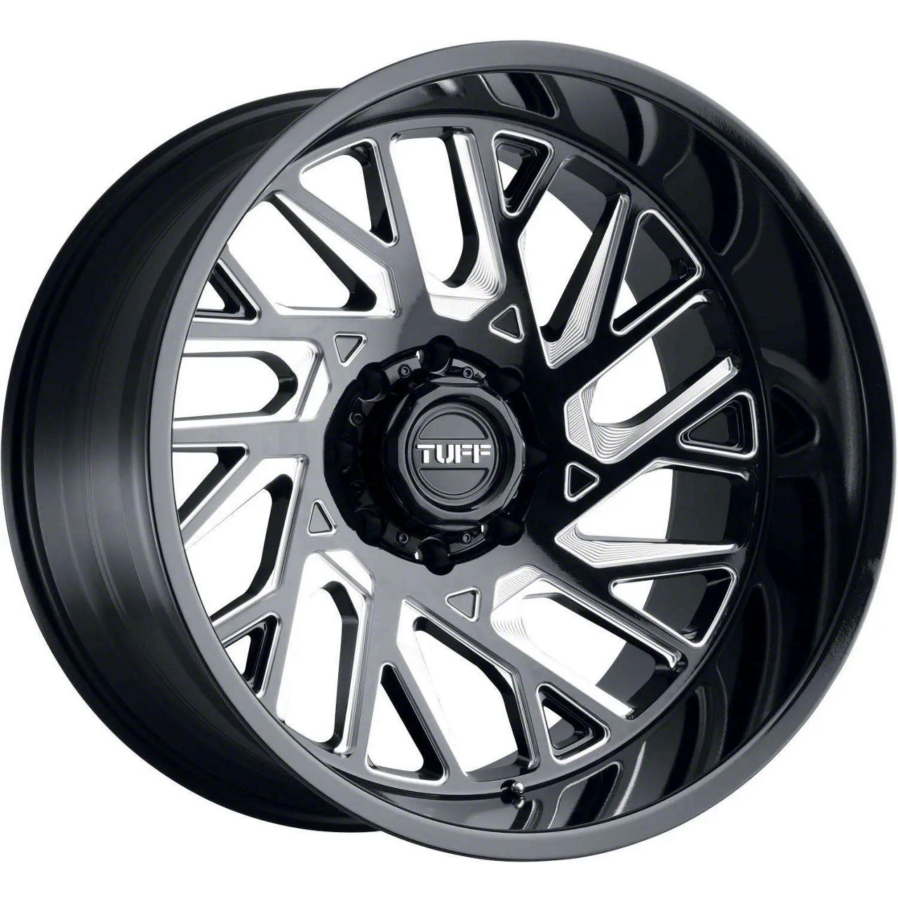 This 20x12 Tuff A.T. T4B Gloss Black Milled 6-Lug Wheel is completed in a high-quality gloss black finish with steel milled accents that will create a striking appearance. There's a durable clear coat that protects against driving hazards.
