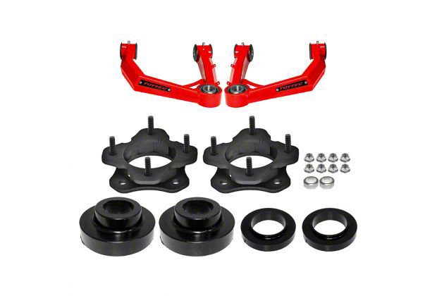 Construction and Appearance. The kit features strut spacers, aluminum rear lift blocks, and rear coils, along with Toytec Boxed Uni-Ball Upper Control Arms for optimized alignment. All components come with a robust powder-coated finish for added protection and a sleek look.
