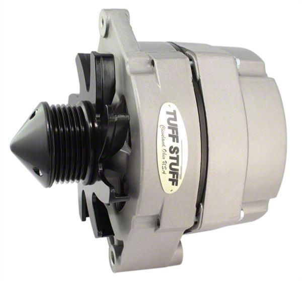 Description. All Tuff Stuff alternators are hand built in Cleveland, Ohio and are tested to meet or exceed OEM specifications. All Tuff Stuff alternators are made from 100% new components and carry a one year limited warranty. Tuff Stuff has alternator applications for virtually all muscle cars, hot rods, customs and light trucks in just about every finish imaginable. Available in chrome plated, polished aluminum, powder coated and plain as cast finishes. All alternators are for 12 volt, negative ground systems, except where noted.