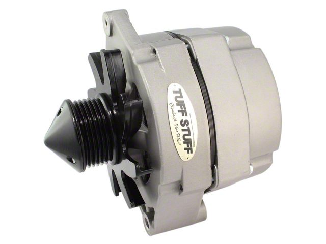 Description. All Tuff Stuff alternators are hand built in Cleveland, Ohio and are tested to meet or exceed OEM specifications. All Tuff Stuff alternators are made from 100% new components and carry a one year limited warranty. Tuff Stuff has alternator applications for virtually all muscle cars, hot rods, customs and light trucks in just about every finish imaginable. Available in chrome plated, polished aluminum, powder coated and plain as cast finishes. All alternators are for 12 volt, negative ground systems, except where noted.