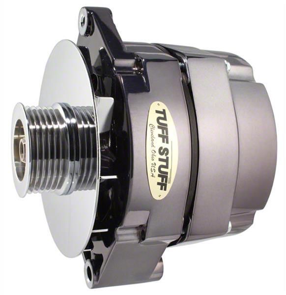 Description. All Tuff Stuff alternators are hand built in Cleveland, Ohio and are tested to meet or exceed OEM specifications. All Tuff Stuff alternators are made from 100% new components and carry a one year limited warranty. Tuff Stuff has alternator applications for virtually all muscle cars, hot rods, customs and light trucks in just about every finish imaginable. Available in chrome plated, polished aluminum, powder coated and plain as cast finishes. All alternators are for 12 volt, negative ground systems, except where noted.