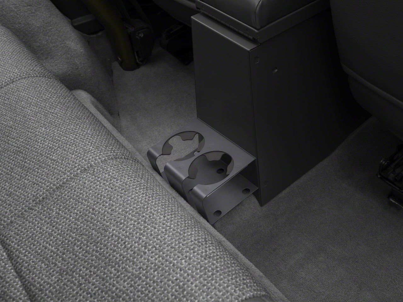 Specs. If you want a rear drink holder that's as tough as your Jeep, then checkout the Tuffy steel drink holder. It's made from sturdy 16 gauge steel and mounts to the 9 degree sloped rear surface of your TJ's center console. Your backseat passengers will have a place to put their fizzy beverages, and it won't snap in half like a plastic cup holder would.