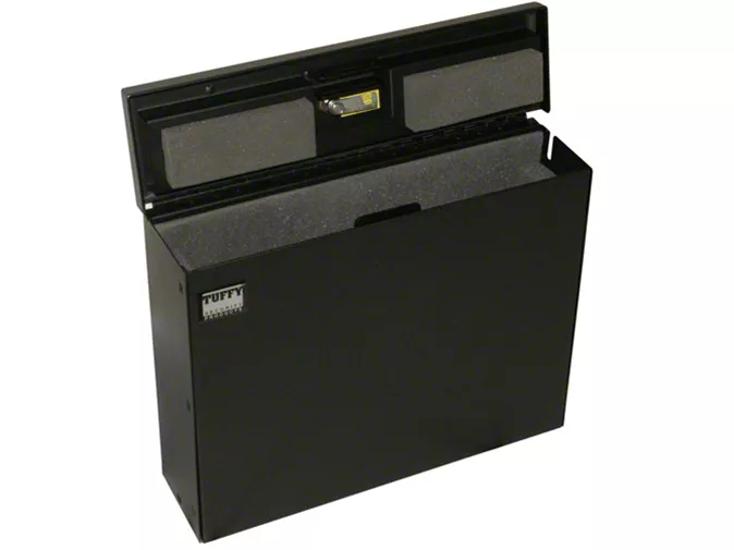 Storage Benefits. This Tuffy Laptop Security Lockbox is constructed of MIG and TIG welded 16-gauge steel, with a double-thick hemmed steel lid, an 1/8 inch steel Pry-Guard latch, a concealed Pin-Lock hinge, and a pick-resistant 10-tumbler lock. The inside is lined with 1-inch and 2-inch foam, and you can either bolt the lockbox directly to your Wrangler, or secure it using an optional cable/padlock mount.