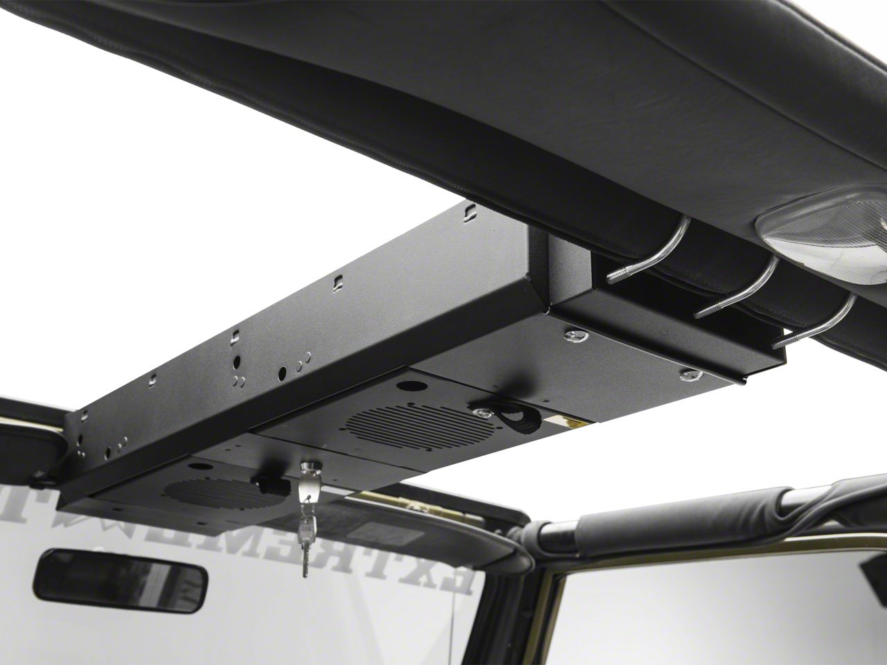 Versatile Design. Tuffy is proud to offer this overhead security console as a premium upgrade for your Jeep Wrangler. It's made of heavy duty, tough 16 gauge steel and featuring a textured black powder coat finish. The console mounts right on to the sport bar and has multiple compartments to help you store your CB radio, speakers, or any other electronic devices you may have.