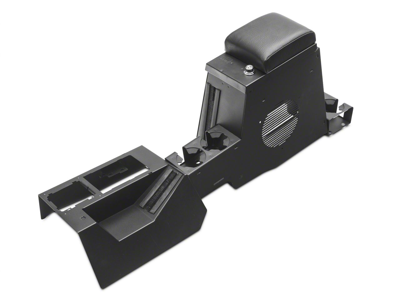Speaker/Storage Unit. This Tuffy Series II Speaker/Storage Security Console; Black is a high-security, 16-gauge steel console that incorporates 2 oversized drink holders in place of a separate stereo compartment and will accommodate the factory sub-woofer or an aftermarket 8 speaker. The front and rear drink holders, padded armrest, and front console for levers are included in this model. The new sleek, custom fit design matches the TJ's refined interior, while offering 2.50 times more storage than the factory model.