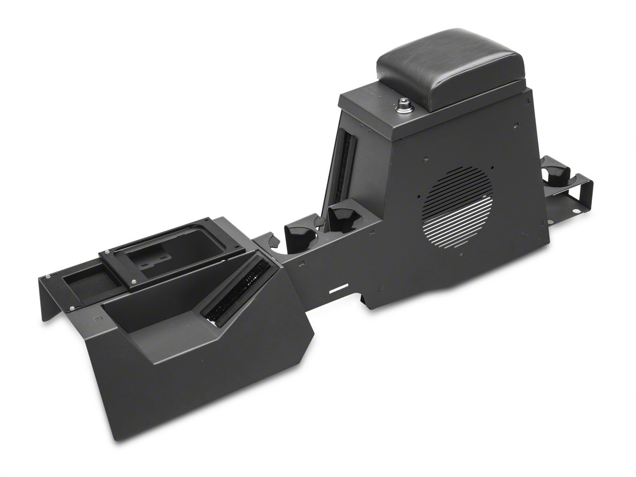 Extra Storage. This high security 16 gauge steel console incorporates two oversized drink holders in place of a separate stereo compartment and will accommodate the factory sub-woofer or an aftermarket 8 speaker. The front and rear drink holders, padded armrest, and front console for levers are included in this model. The new sleek, custom fit design matches the TJs refined interior while offering 2 1/2 times more storage than the factory model.
