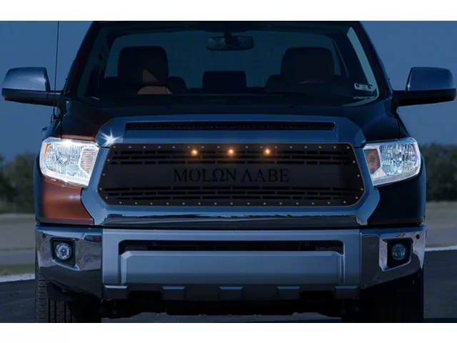 Application. The 1-Piece Steel Upper Grille Insert; Molon Labe with Amber Raptor Lights fits 2014-2017 Toyota Tundra models.