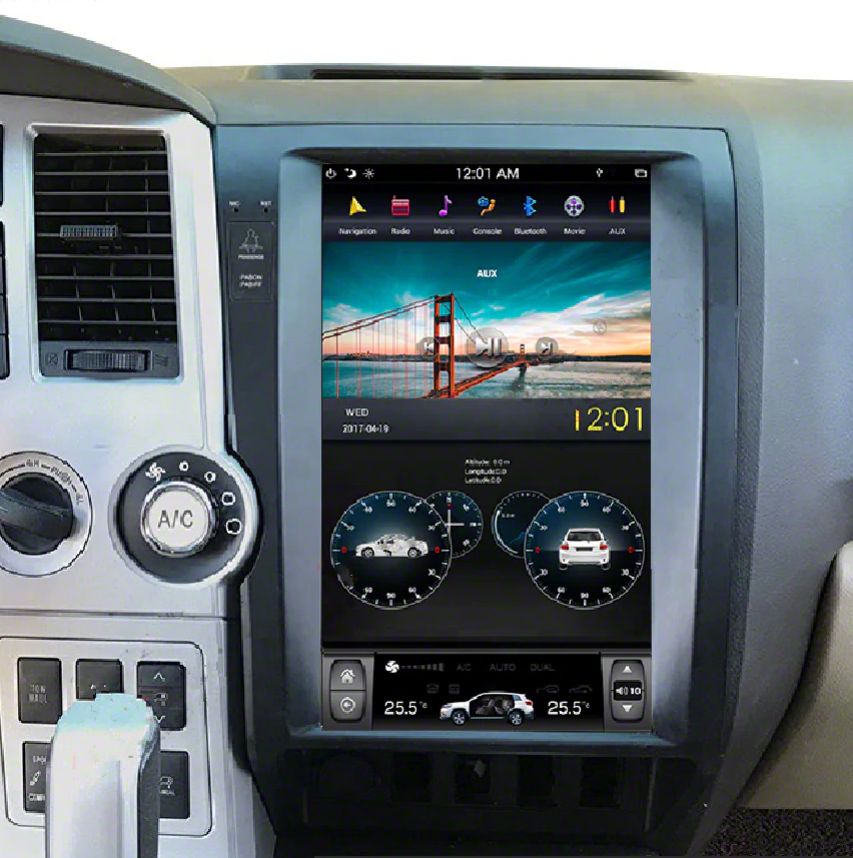 Upgrade Your Navigation and Radio. Give your Tundra a Tesla-inspired interior with this 13.60-Inch Android 9 Fast Boot Vertical Screen Navigation Radio. This upgrade gets rid of your old-fashioned factory radio, replacing it with a super sleek 1600 x 1200 13.60-inch HD touch screen. From the unit, you can control your A/C, set your navigation, and entertain yourself and your passengers with multimedia content from your phone.