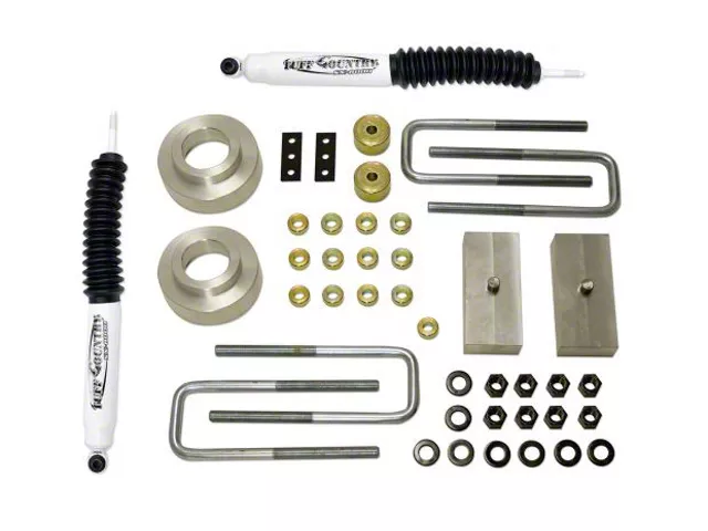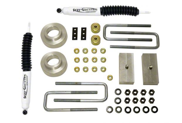 Construction and Appearance. The kit includes precision-machined aluminum coil spacers for long-lasting strength, along with differential drop spacers to correct CV axle angles and reduce wear. Tuff Country SX8000 rear nitro gas shocks are included for improved ride control and stability. Made in the USA, this lift kit offers durability and performance backed by quality craftsmanship.