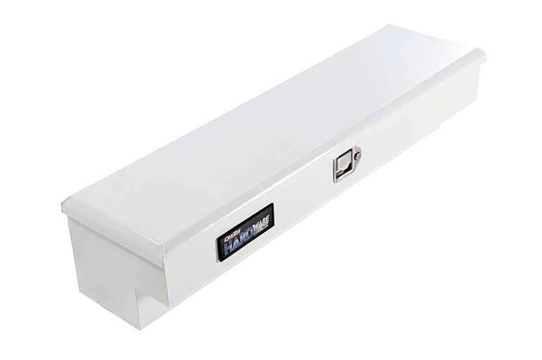 Dee Zee Tool Box - Hardware Side Mount Boxes. Constructed of durable 20-gauge steel. Protected by wrinkle white NRT(TM) (No Rust Technology) rust inhibitor powder coat finish. Crown style lid with a full pan double-V stiffener for superior rigidity. Other features: lockable stainless steel paddle handles, dampened gas shocks, closed cell foam gasket, and self-adjusting strikers.