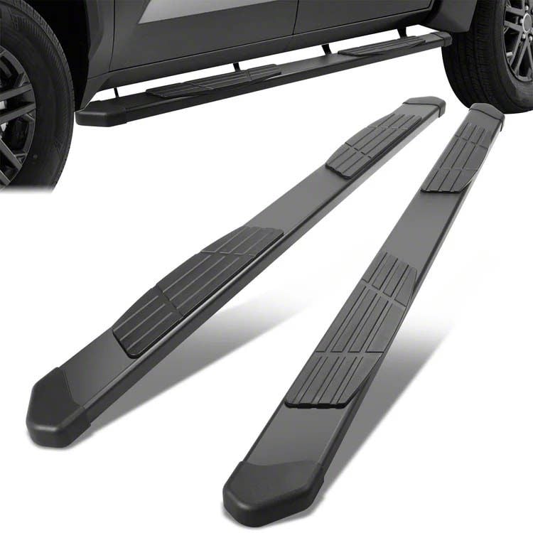 Construction and Appearance. Built with heavy-duty steel and coated in a black powder finish, these running boards are corrosion-resistant and durable, ensuring they stand up to the elements. The slip-resistant, textured surface adds safety, providing a secure footing even in wet or muddy conditions.