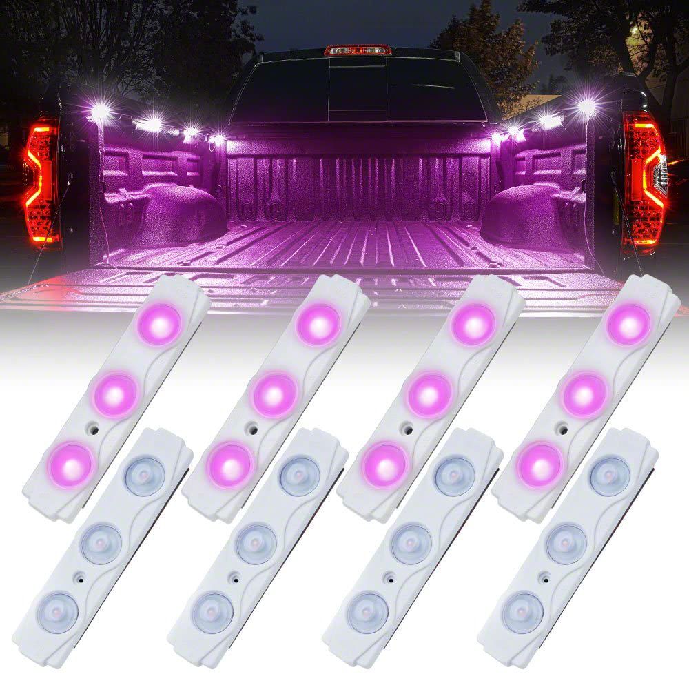 Illuminates Your Truck Bed. Holding a flashlight every time you need something from your truck bed can limit your movement. That's why it’s best if you invest in this Purple 8-LED Rock Light Pod Truck Bed Lighting Kit. This kit comes with rock light pods that can be mounted at your truck’s bed rails. These pods produce luminous LED lighting, so you can clearly see everything in your truck bed.
