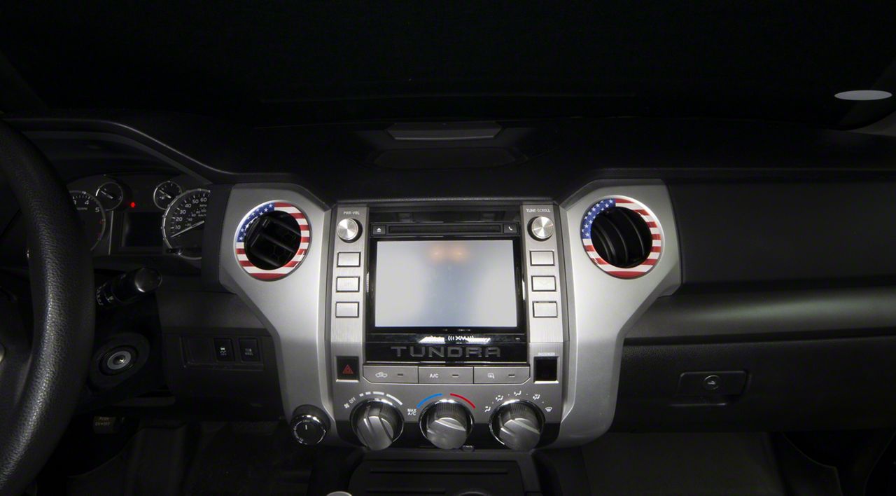 Interior Styling. Add a new interior look to your Toyota Tundra with this set of A/C Vent Ring Cap Accent Trim; American Flag Edition. These 4 pieces give a cool style appearance and they are positioned on each chrome vent ring.