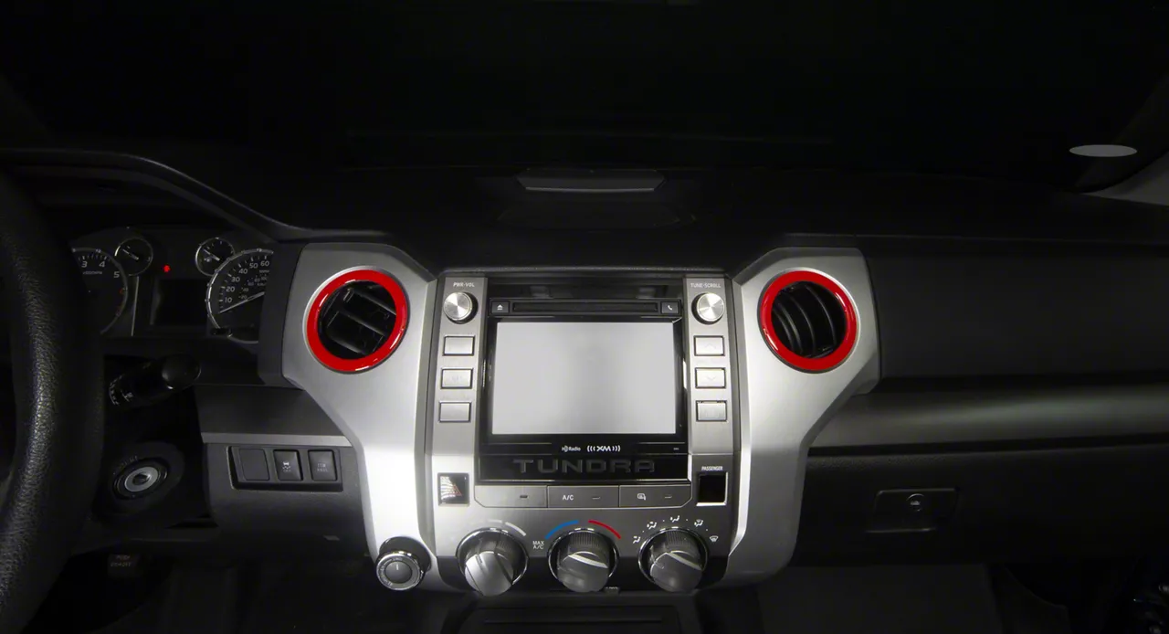 Interior Styling. Add a new interior look to your Toyota Tundra with this set of A/C Vent Ring Cap Accent Trim; Gloss TRD Red. These 4 pieces give a cool style appearance and they are positioned on each chrome vent ring.