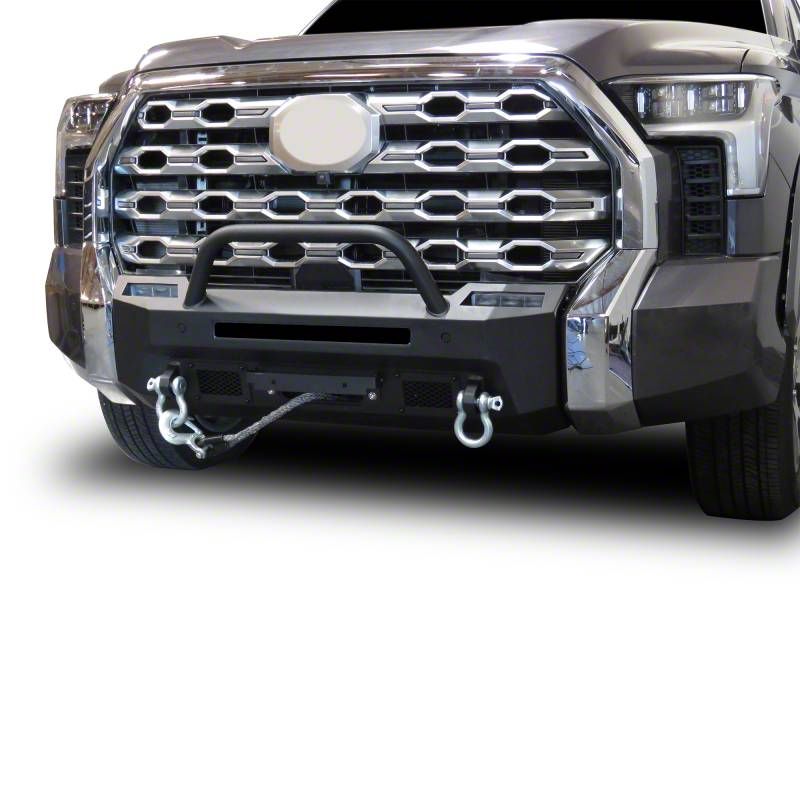 Integrated Winch-Ready Armor. The Armour III Heavy Duty Winch Front Bumper with 12K Synthetic Rope Winch is a rugged, high-strength solution for overlanding and recovery on the latest generation of Toyota Tundras. Engineered for tight fitment against the factory bumper, this bumper delivers heavy-duty protection and comes complete with a 12,000 lb synthetic rope winch for serious recovery situations. Ideal for off-road enthusiasts looking to enhance front-end durability and function.
