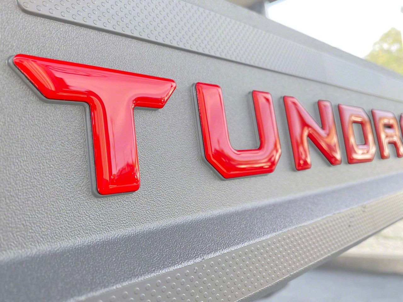 Bold Tailgate Customization. The Bed Rail Tailgate Letter Overlays are designed to add a striking and personalized touch to your Tundra's tailgate. Featuring a racing red finish and a raised, stylish lettering design, these overlays prominently display the Tundra logo, enhancing the vehicle's overall look.