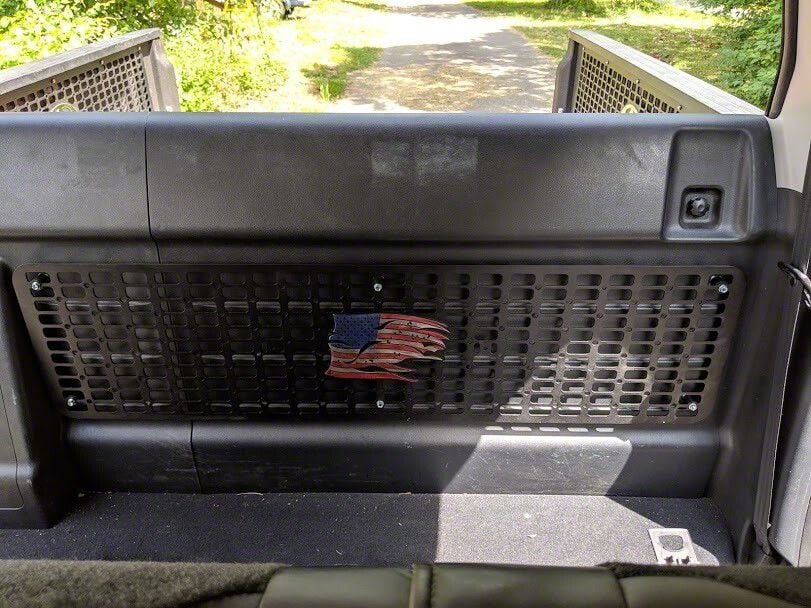 Construction and Appearance. This Behind Seat Molle Panel is fashioned from 11-gauge steel, which is remarkably powerful. The panel is finished in a black powder coat and the whole thing is CNC laser cut for a perfect fit.