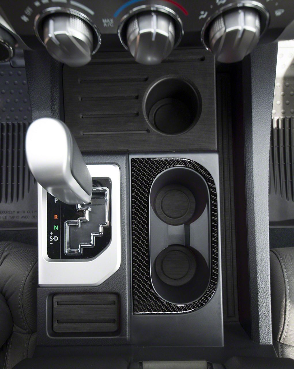 Appearance. Add a new interior look to your Toyota Tundra by installing Center Console Cup Holder Replacement Accent Trim; Domed Carbon Fiber. This piece adds style and protection to your vehicle and replaces the chrome OEM accent on the center console cup holder.