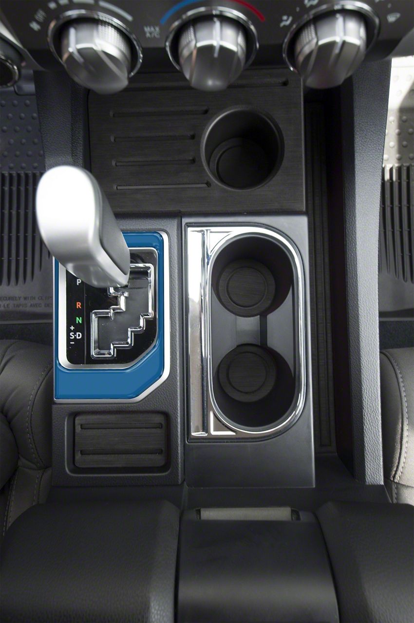 Interior Styling. Add a new interior look to your Toyota Tundra with this Center Console Shifter Accent Trim; Cavalry Blue. This pieces gives a cool style appearance and is positioned on the center console shifter.