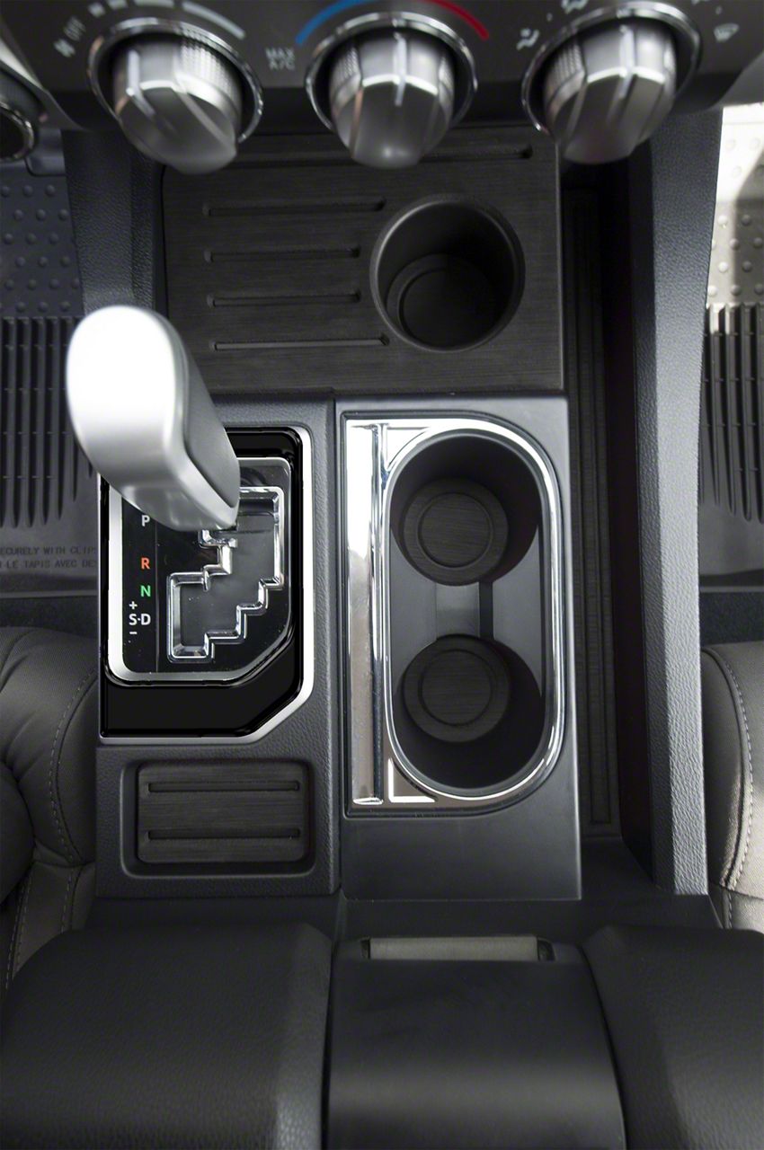 Interior Styling. Add a new interior look to your Toyota Tundra with this Center Console Shifter Accent Trim; Gloss Black. This pieces gives a cool style appearance and is positioned on the center console shifter.