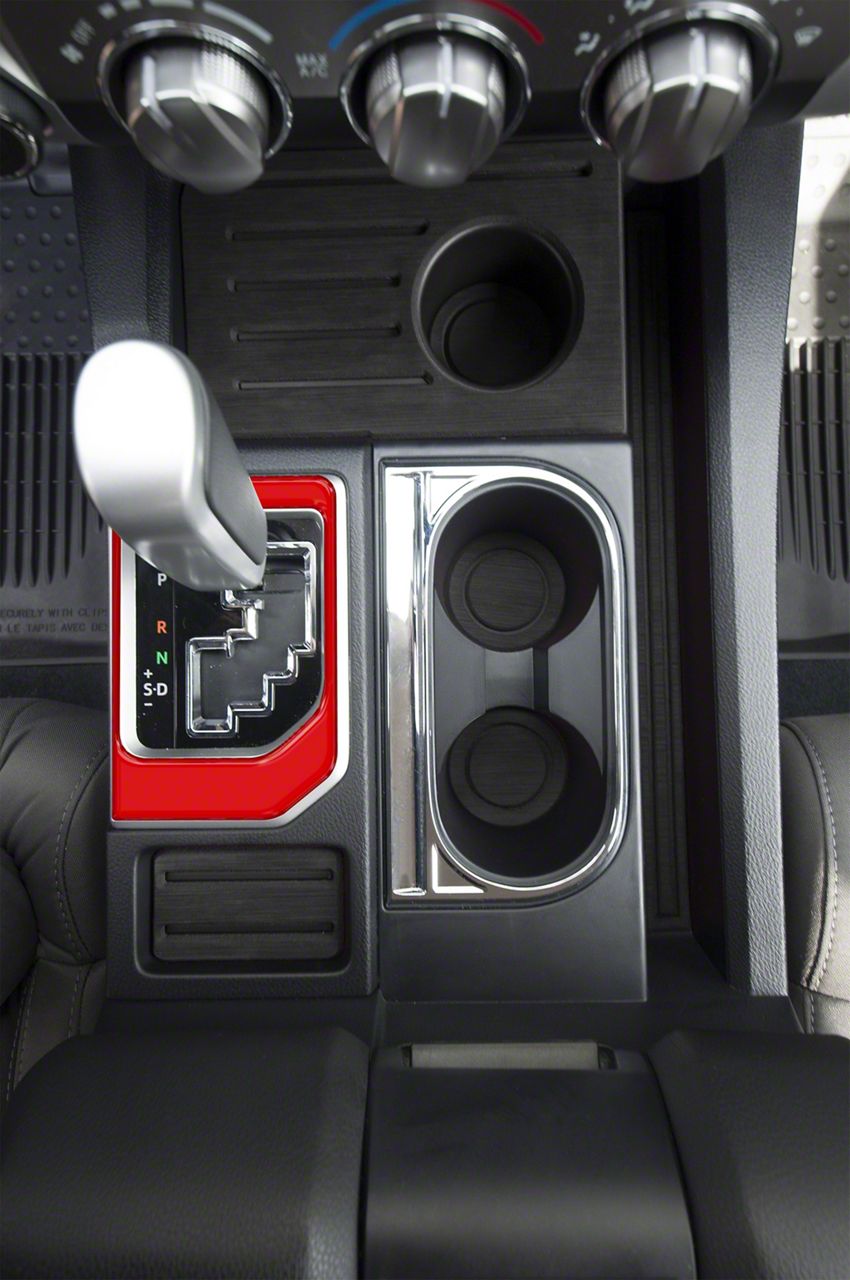 Interior Styling. Add a new interior look to your Toyota Tundra with this Center Console Shifter Accent Trim; Gloss TRD Red. This pieces gives a cool style appearance and is positioned on the center console shifter.