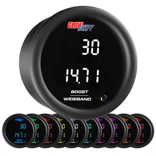Precision Dual-Function Monitoring. The Digital Dual Boost/Vacuum and Wideband Air/Fuel Ratio Gauge offers real-time, simultaneous readings of your vehicle's boost pressure and air/fuel mixture. Designed with a sleek black 10-color display, it enhances both the performance monitoring and interior styling of your ride. This gauge is essential for performance enthusiasts who demand accurate tuning feedback from a compact, multi-functional device.