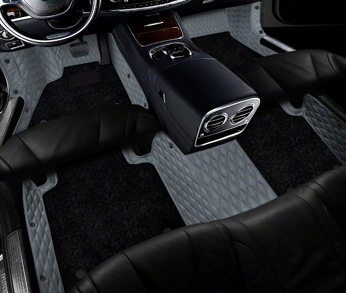 Double Layered. Made for the Toyota Tacoma Double Cab, these Floor Mats come in a diamond-textured finish that has a grey base layer with a black top layer. A front and rear model, these mats are double-layered with carpet and leather layers that are reversible.