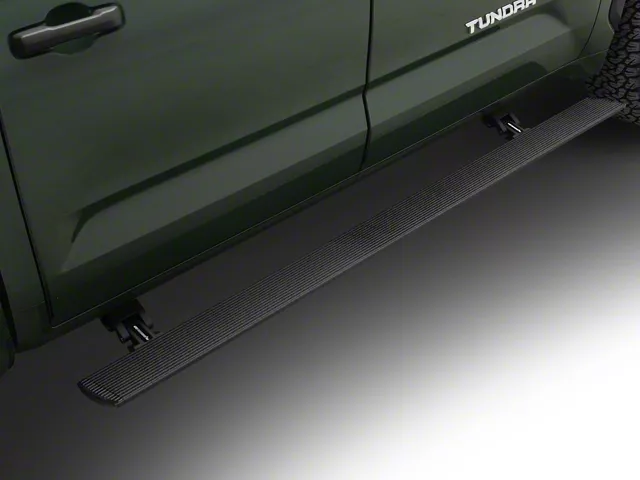 Design. The Go Rhino E-BOARD E1 Electric Running Boards are designed with an advanced automatic deployment and retraction mechanism that activates seamlessly when the vehicle doors are opened and closed. This smart feature not only enhances the functionality by providing a reliable and convenient step but also preserves the streamlined aesthetics of your Tundra by retracting flush against the body, maintaining the sleek profile when not in use. The integration of this system offers both a practical benefit and a touch of modern elegance to your vehicle, making entry and exit exceptionally smooth and effortlessly stylish.