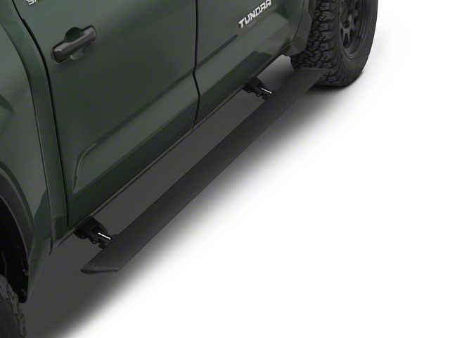 Sophisticated Accessibility. The Go Rhino E-BOARD E1 Electric Running Boards are built for your Toyota Tundra CrewMax, offering an advanced, automatic solution for easier vehicle entry and exit. Furthermore, these running boards feature a sleek design with a textured black finish and are equipped with a powerful LED light kit that illuminates when deployed, enhancing visibility and safety.