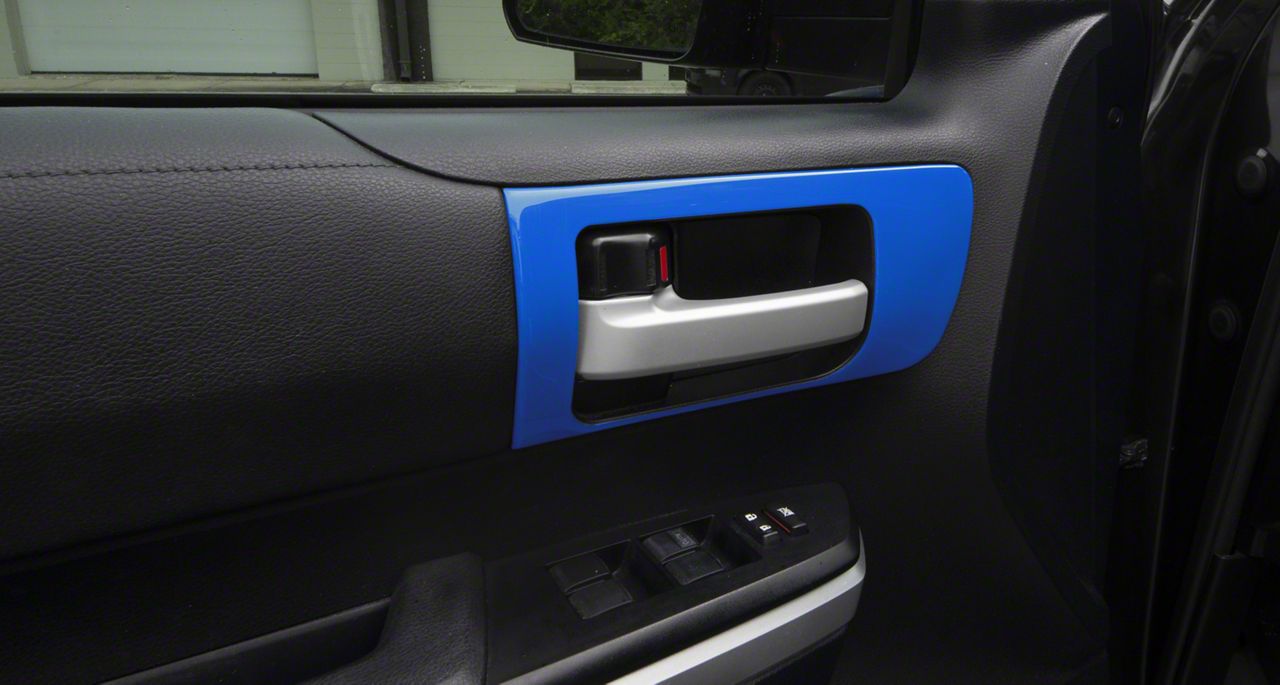 Handle Style. If you want your Tundra to stand out from the crowd, never forget the small details. This Front Door Handle Accent Trim; Voodoo Blue is a perfect example of such detail. These 2 pieces go on the trim around each door handle and will make your truck's interior shine.